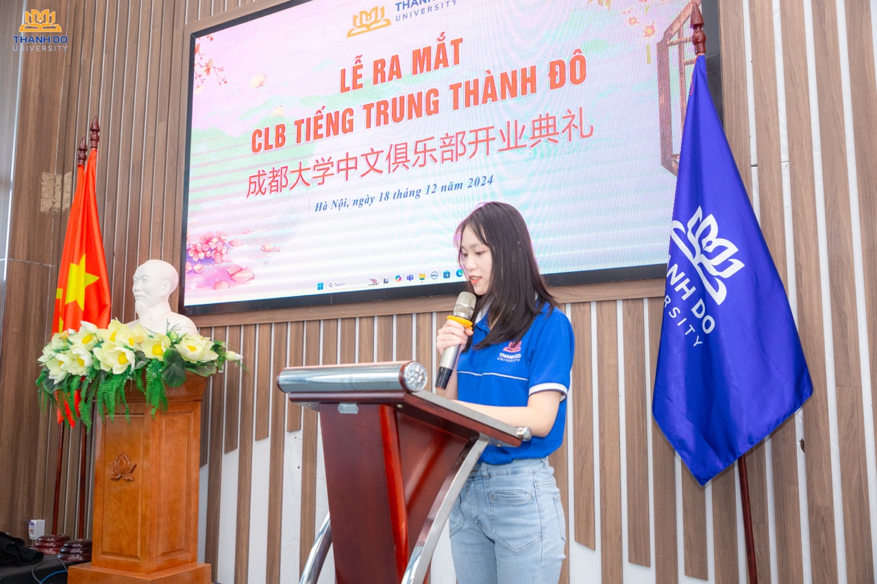 Đinh Thị Tú Uyên – Chủ nhiệm Câu lạc bộ Tiếng Trung phát biểu tại sự kiện