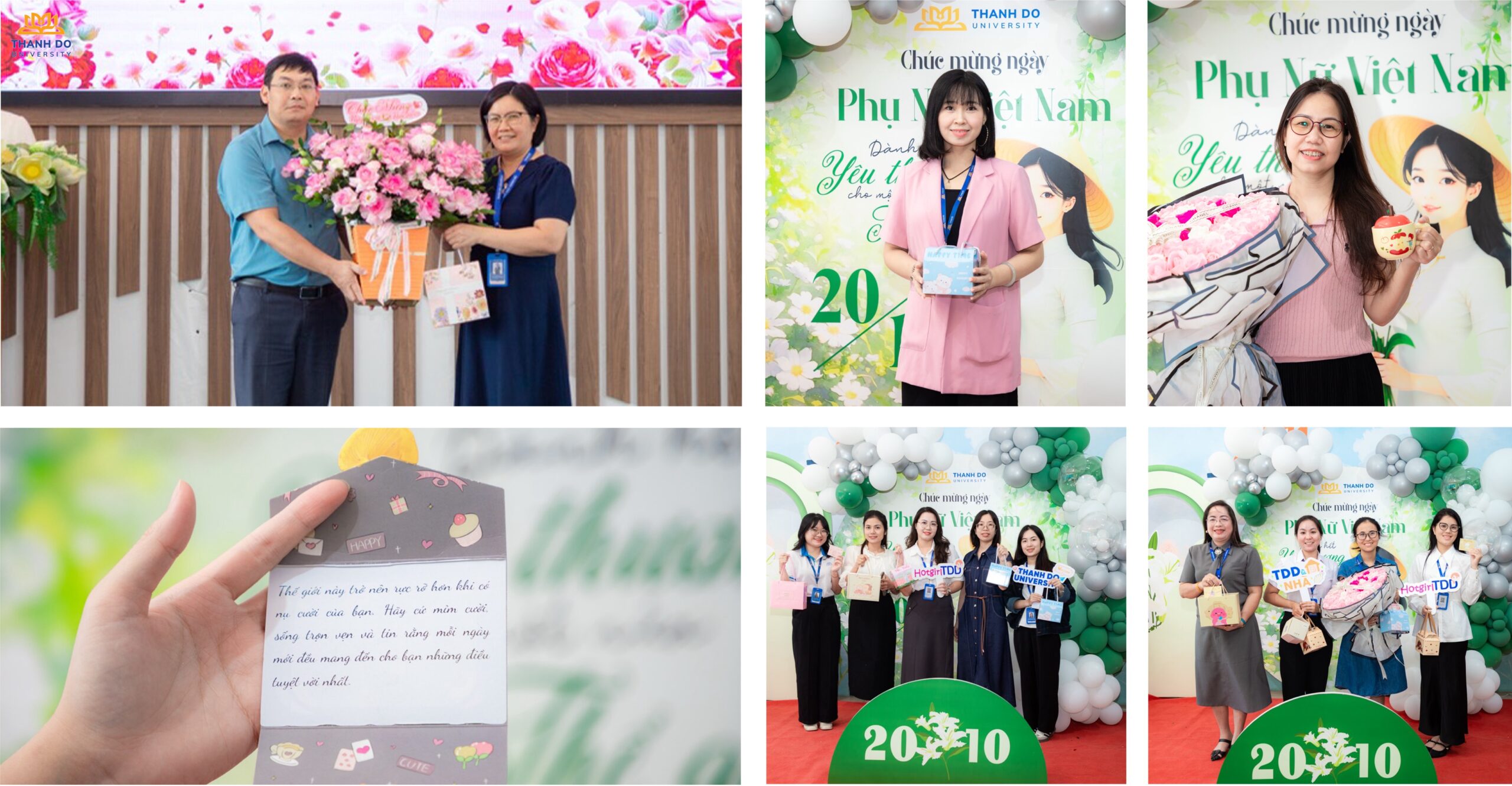 Đặc biệt, Nhà trường đã chuẩn bị những món quà nhỏ xinh cùng lời chúc thân thương gửi tặng đến toàn thể nữ cán bộ, giảng viên và nhân viên như một lời tri ân dịu dàng trong ngày đặc biệt này. Bên cạnh đó, khu check-in được trang trí riêng cho ngày 20/10 cũng trở thành điểm nhấn, nơi mọi người lưu lại những khoảnh khắc rạng rỡ, tràn đầy yêu thương của tập thể Thado Edupark.