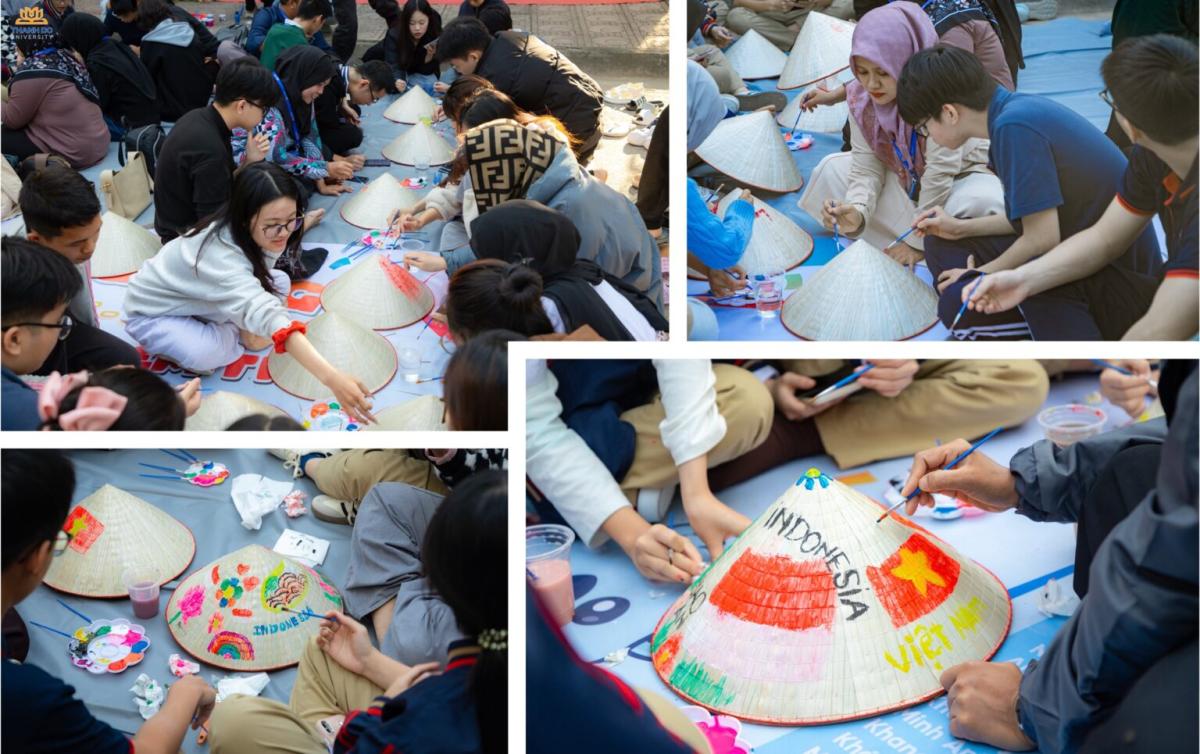 The conical hat (Non la), a familiar symbol of Vietnamese culture, became a unique artistic experience for Indonesian students. Through painting, they freely expressed creativity using colors and patterns that conveyed personal messages and cultural meaning.