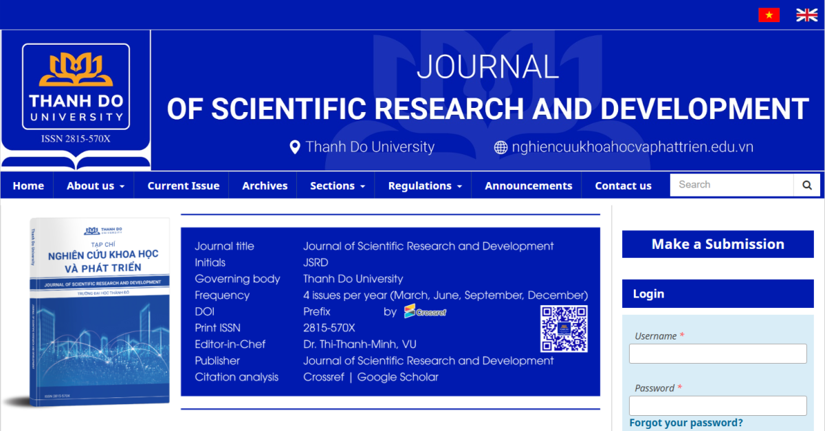 The Journal of Scientific Research and Development serves as an official academic publication of Thanh Do University, carrying out the institution’s mission of advancing scientific research and technological application. It provides an educational platform for publishing research findings, disseminating scientific information, and promoting knowledge exchange in various fields, including Strategy, Policy and Law; Science, Education and Technology; Economics and Society; and Social Sciences.