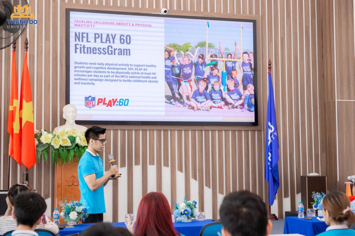 Nguyen Huu Quang (D112K13) confidently presented on Physical Education, offering practical tips for student health improvement