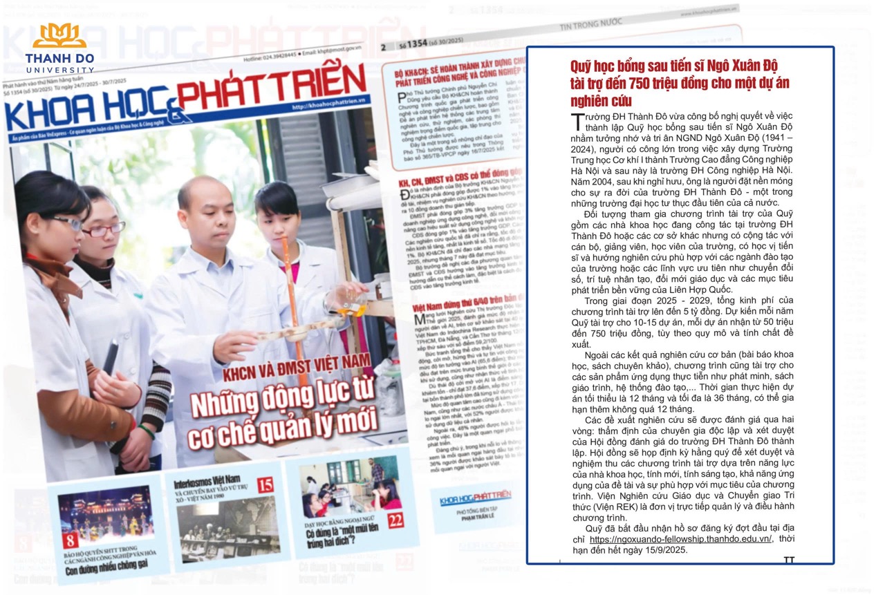 | Quỹ Học bổng sau tiến sĩ Ngô Xuân Độ đã chính thức mở cổng tiếp nhận hồ sơ đăng ký từ các nhà khoa học có quan tâm. Quý nhà khoa học có thể tìm hiểu thông tin chi tiết về quy định, tiêu chí và quy trình của chương trình tại website của Quỹ, truy cập tại https://ngoxuando-fellowship.thanhdo.edu.vn/