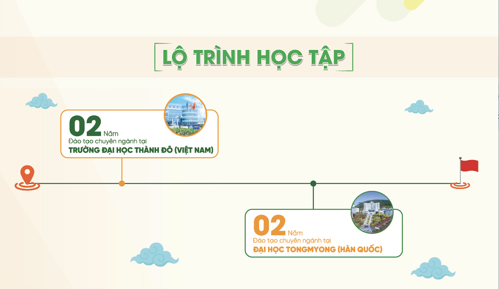Lộ trình học được thiết kế khoa học, trong đó sinh viên sẽ học 2 năm đầu tại Đại học Thành Đô, tập trung rèn luyện tiếng Anh, các môn đại cương và cơ sở ngành; sau đó chuyển tiếp 2 năm cuối tại Đại học Tongmyong để hoàn thiện chuyên môn và nhận bằng cử nhân quốc tế do trường Hàn Quốc cấp.