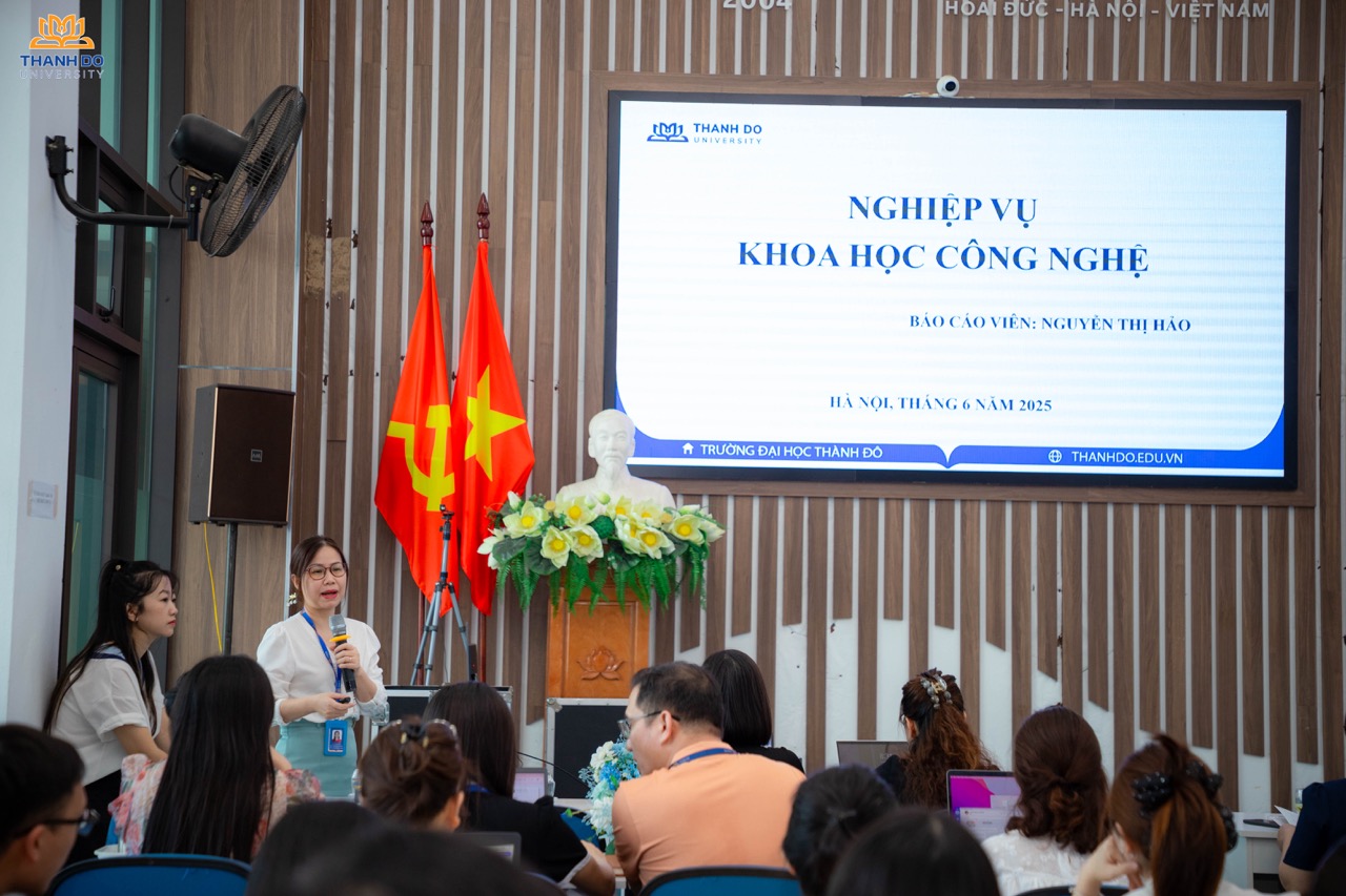 ThS. Nguyễn Thị Hảo, Phó trưởng phòng Khoa học công nghệ trình bày chuyên đề về nghiệp vụ nghiên cứu khoa học và công nghệ, tập trung hướng dẫn cán bộ giảng viên quy trình đề xuất, đăng ký và triển khai các đề tài nghiên cứu khoa học, từ khâu xây dựng thuyết minh, xác định mục tiêu – sản phẩm, đến công tác nghiệm thu, công bố kết quả, và đăng ký sở hữu trí tuệ.