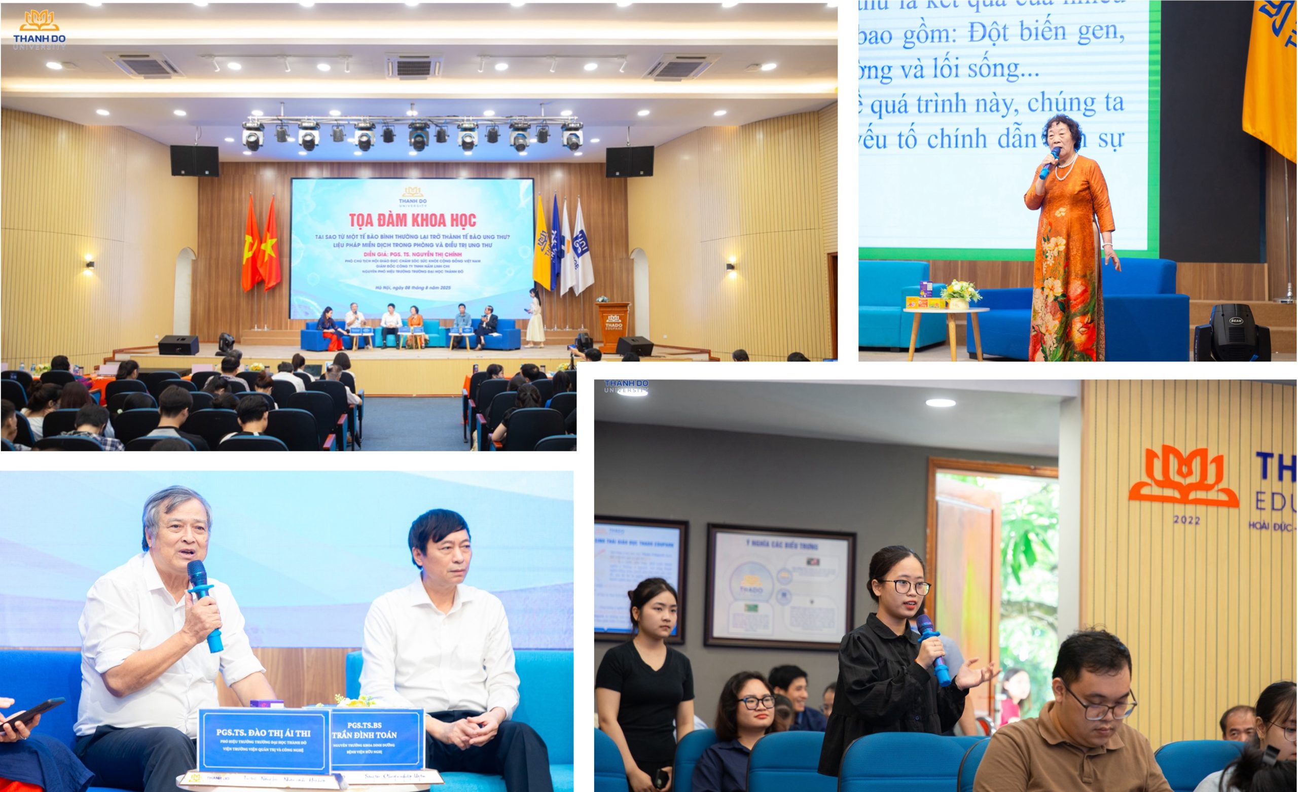Toạ đàm với sự tham gia của PGS.TS Đào Thị Ái Thi, Phó hiệu trưởng, TS. Nguyễn Ngọc Linh, Quyền Viện trưởng Viện Y-Dược, cùng các thầy cô và sinh viên thuộc Viện. Bằng kiến thức chuyên mô thông qua nhiều năm nghiên cứu và kinh nghiệm làm việc thực tiễn, Diễn giả, chuyên gia PGS.TS. Nguyễn Thị Chính – Phó chủ tịch Hội Giáo dục Chăm sóc Sức khỏe Cộng đồng Việt Nam, Nguyên Phó hiệu trưởng trường Đại học Thành Đô, Giám đốc Công ty TNHH Nấm Linh Chi, mang đến những thông tin y học trọng tâm, thiết thực và cập nhật về một trong những vấn đề lớn hiện nay – Ung thư.