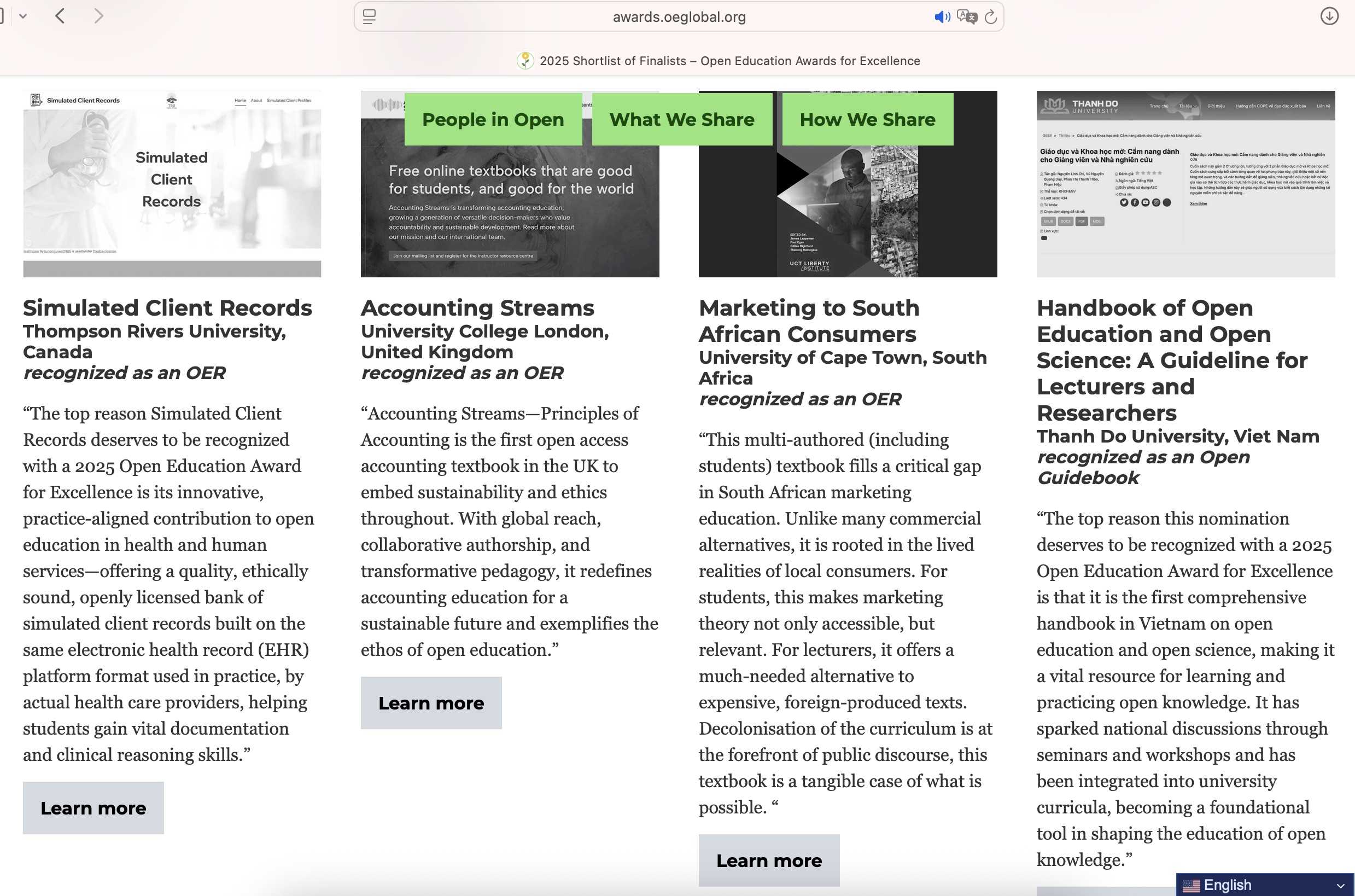 Trong tổng số 193 đề cử được gửi về từ 42 quốc gia, cuốn sách “Giáo dục và Khoa học mở: Cẩm nang hướng dẫn dành cho giảng viên và nhà nghiên cứu” đã vinh dự lọt vào danh sách rút gọn (shortlist), nằm trong số 16 đề cử xuất sắc nhất của hạng mục Tài nguyên mở (What we share).