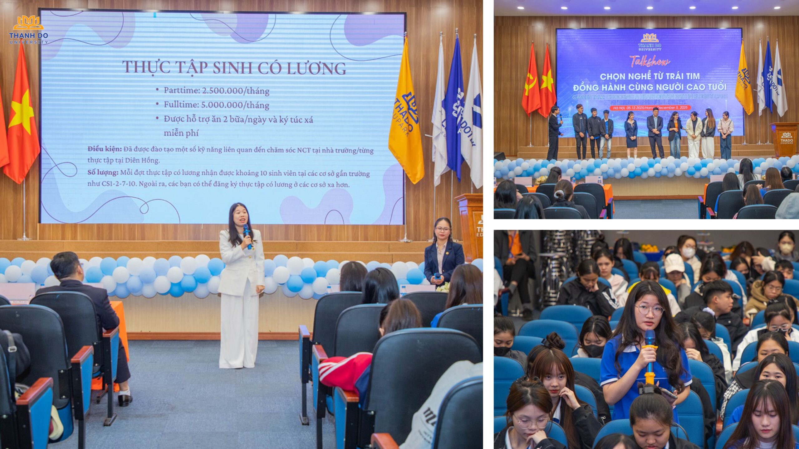 Không khí talkshow tại hội trường sôi nổi và gần gũi: sinh viên đặt nhiều câu hỏi về công việc thực tế, áp lực nghề, cơ hội phát triển bản thân; diễn giả chia sẻ chân thành bằng những câu chuyện đời thường, những tình huống chăm sóc người cao tuổi rất “đời” nhưng đầy xúc động.