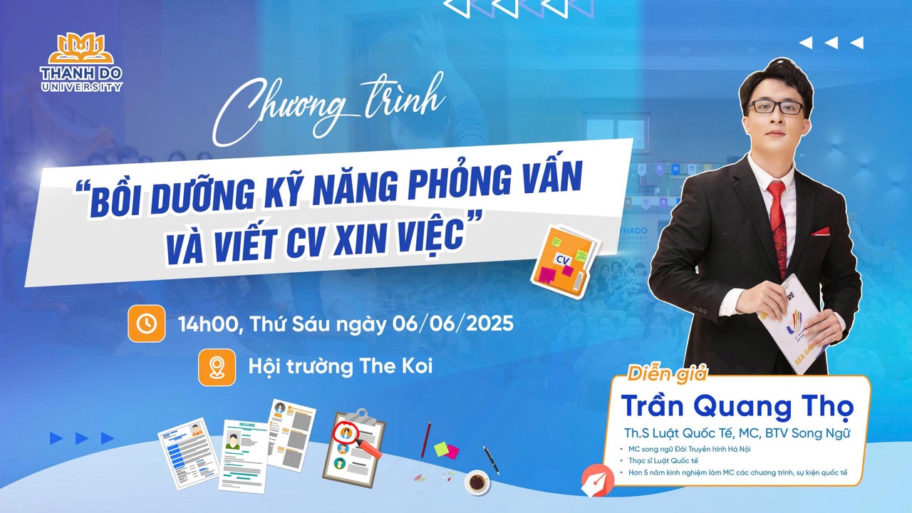 Chương trình sẽ mang đến cho người học cơ hội tìm hiểu về các kỹ thuật viết CV nổi bật, bí quyết trả lời phỏng vấn thông minh, cũng như phát triển các kỹ năng mềm quan trọng như giao tiếp, làm việc nhóm, giải quyết vấn đề và quản lý thời gian. Đặc biệt, buổi chia sẻ có sự đồng hành của ThS. Trần Quang Thọ – MC song ngữ, biên tập viên Truyền hình Hà Nội, người đã có hơn 5 năm kinh nghiệm dẫn dắt các chương trình quốc tế, sẽ mang đến những lời khuyên thiết thực từ thực tế tuyển dụng.
