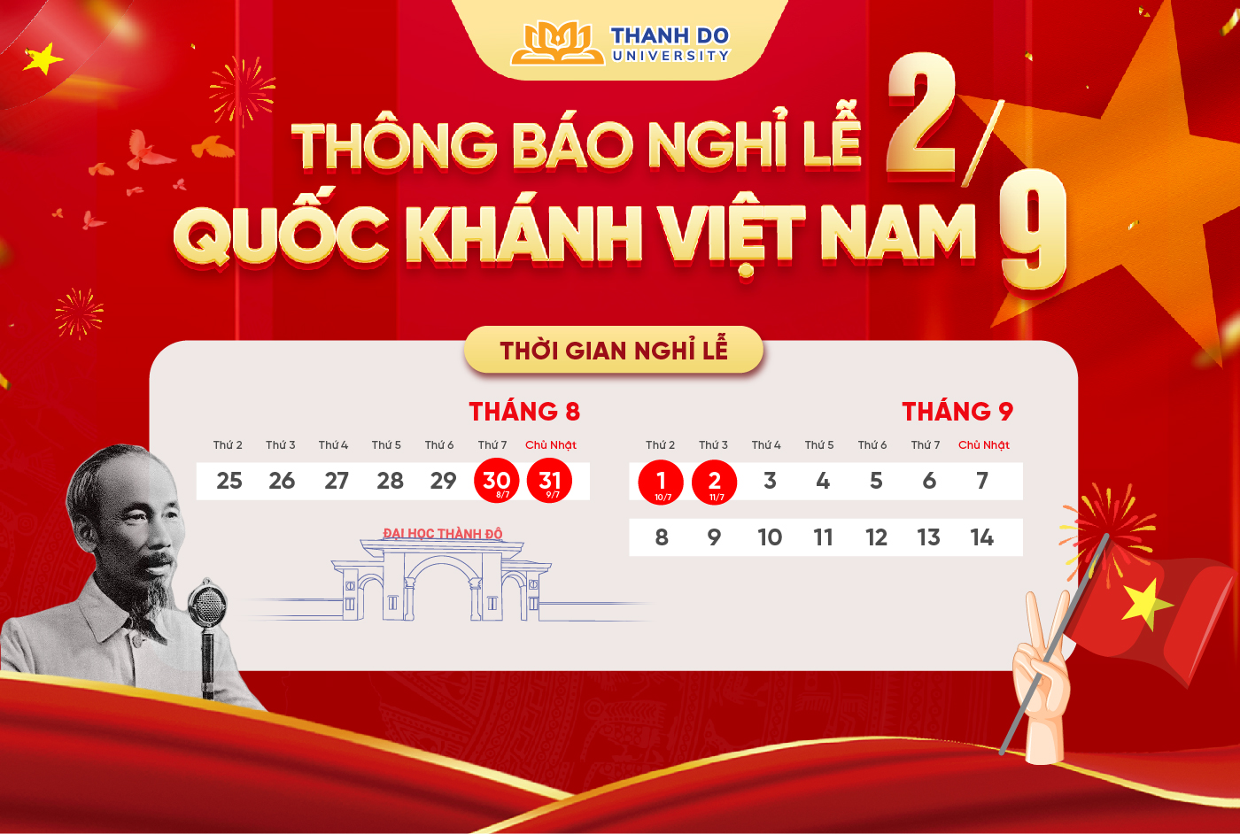 Trường Đại học Thành Đô thông báo kế hoạch nghỉ Lễ Quốc khánh 2/9 tới cán bộ, giảng viên, nhân viên và sinh viên, học viên như sau: