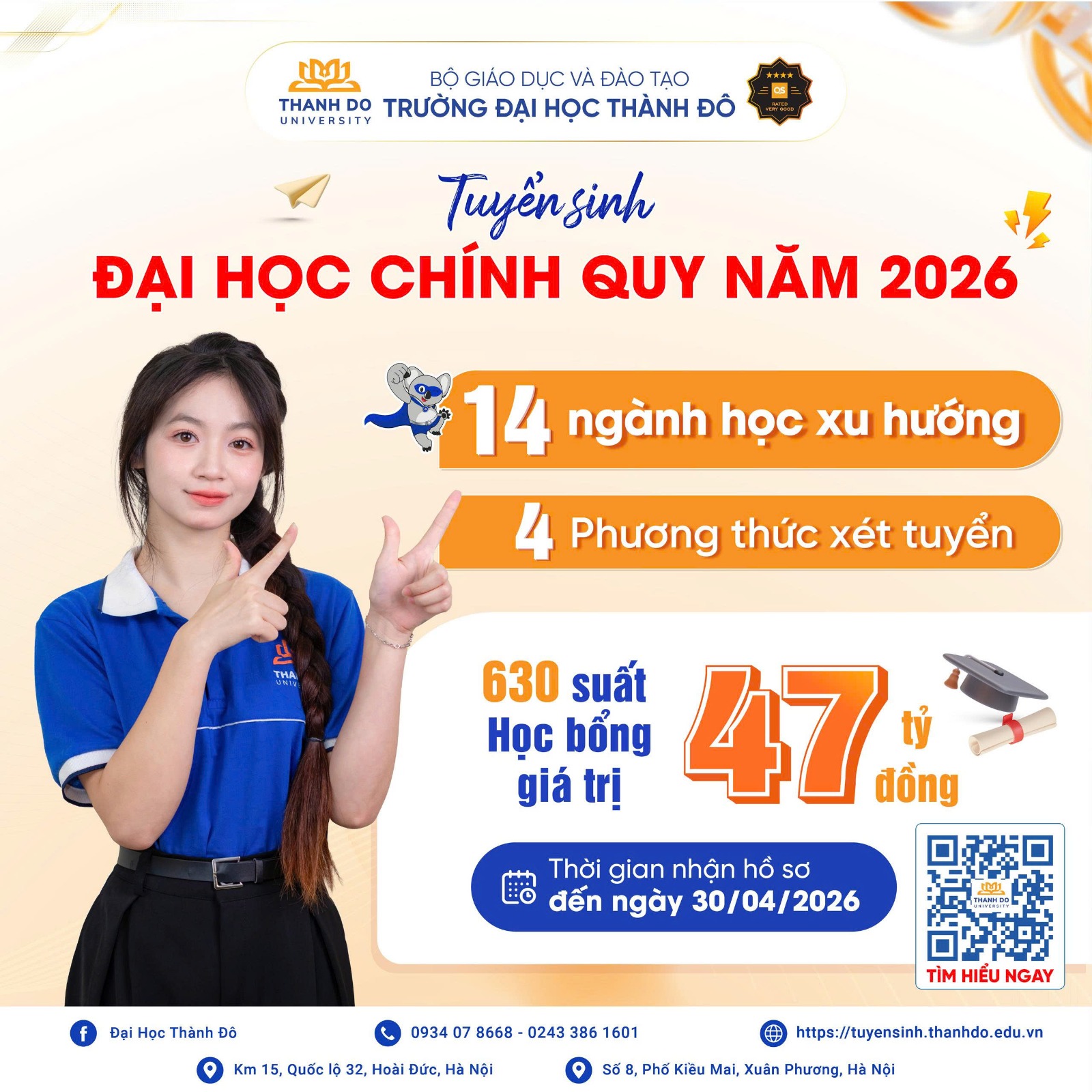 Trường Đại học Thành Đô công bố thông tin tuyển sinh đại học chính quy năm 2026. Theo đó, Trường tuyển sinh 14 ngành đào tạo với 04 phương thức xét tuyển; triển khai chương trình đào tạo theo địa chỉ ngành Điều dưỡng, mở rộng cơ hội trúng tuyển cho thí sinh trên cơ sở đánh giá toàn diện năng lực học tập, hoạt động và tiềm năng phát triển cá nhân.