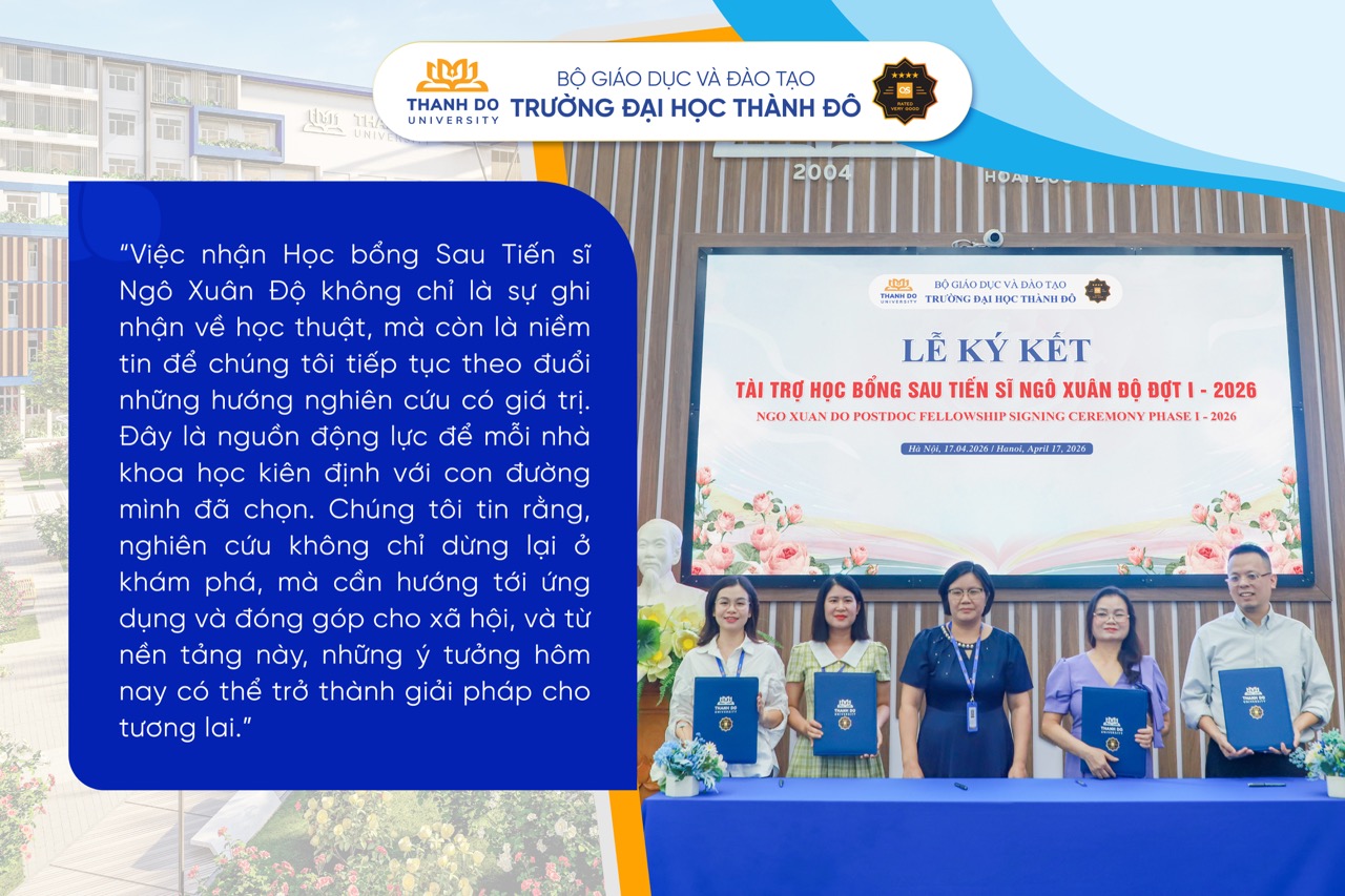 Điểm chung của các đề tài không chỉ nằm ở tính ứng dụng thực tiễn, mà còn ở sự đồng hành từ Quỹ học bổng Sau Tiến sĩ Ngô Xuân Độ, Trường Đại học Thành Đô. Với vai trò là nguồn lực hỗ trợ quan trọng, học bổng không chỉ giúp các nhà khoa học có điều kiện tập trung triển khai nghiên cứu, mà còn mở ra cơ hội kết nối, hợp tác và phát triển theo chiều sâu trong môi trường học thuật chuyên nghiệp.