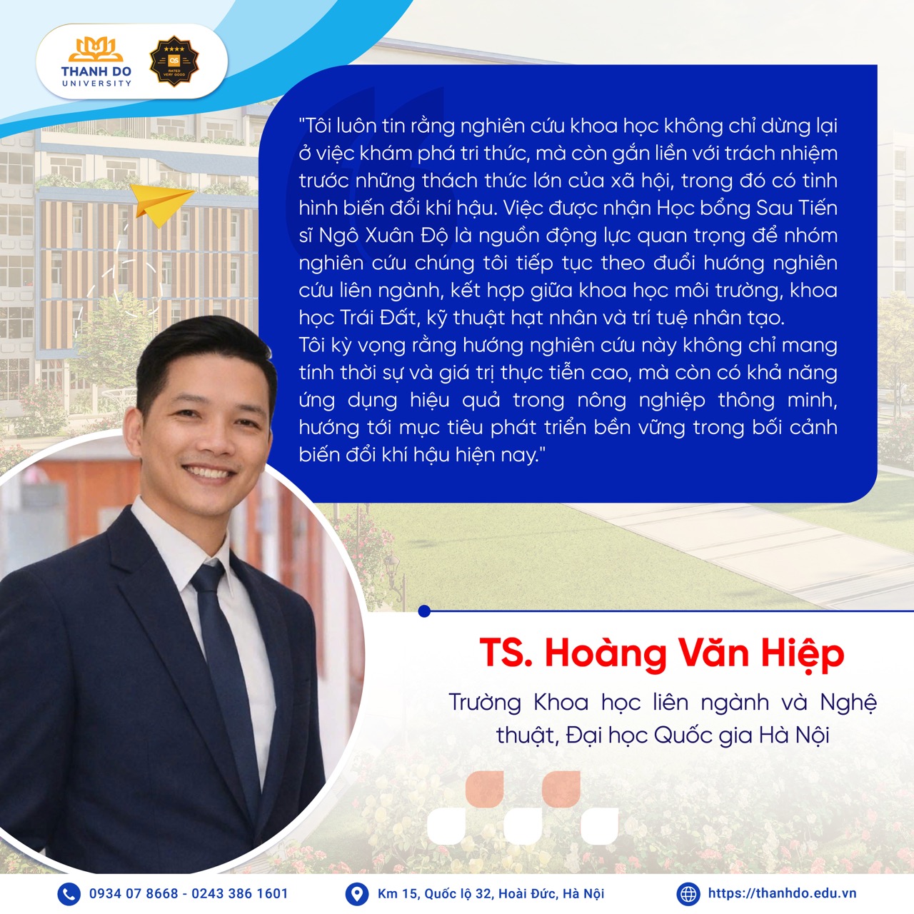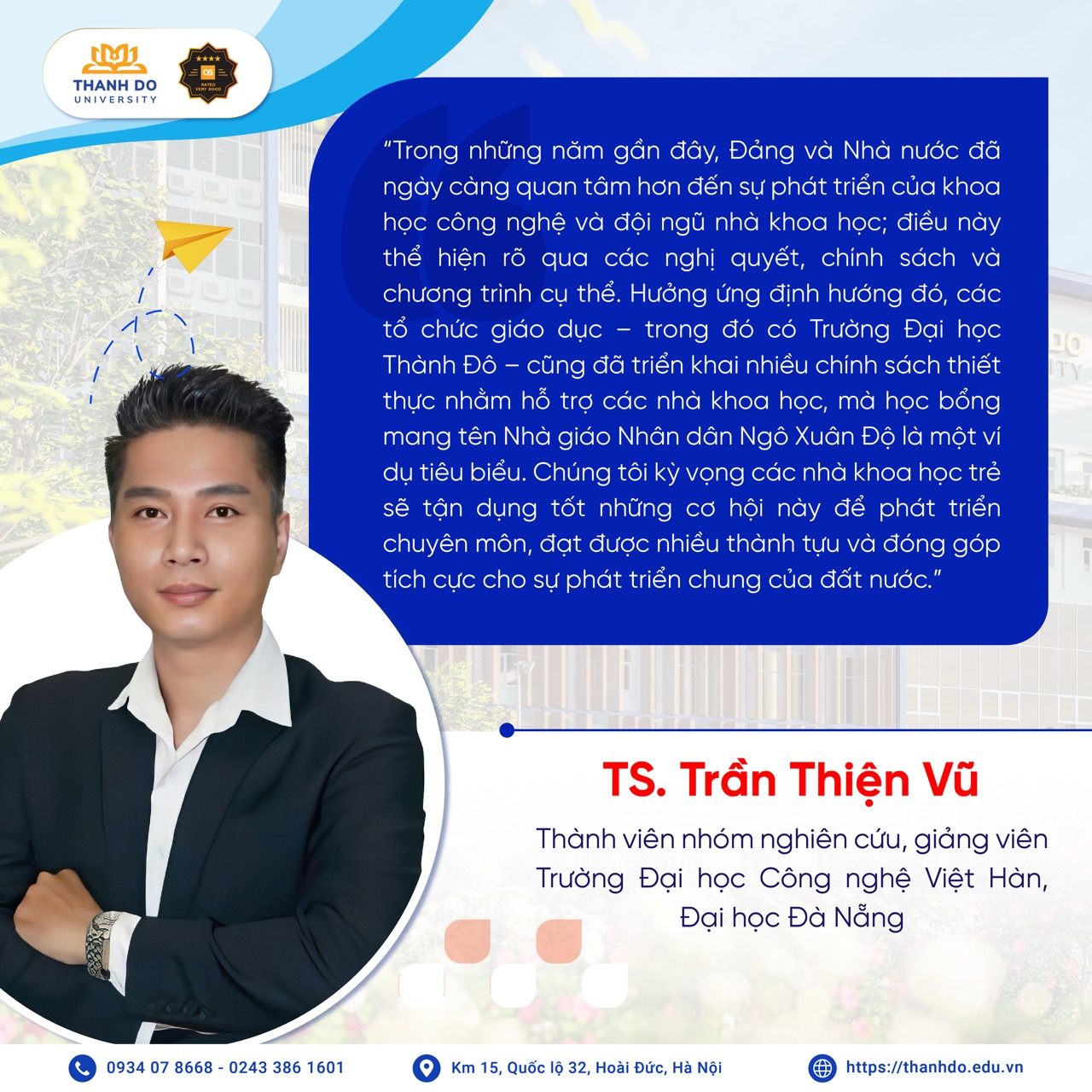 Chia sẻ về bối cảnh phát triển khoa học công nghệ hiện nay, TS. Trần Thiện Vũ – thành viên nhóm nghiên cứu, giảng viên Trường Đại học Công nghệ Việt Hàn, Đại học Đà Nẵng – cho biết: “Trong những năm gần đây, Đảng và Nhà nước đã ngày càng quan tâm hơn đến sự phát triển của khoa học công nghệ và đội ngũ nhà khoa học; điều này thể hiện rõ qua các nghị quyết, chính sách và chương trình cụ thể. Hưởng ứng định hướng đó, các tổ chức giáo dục – trong đó có Trường Đại học Thành Đô – cũng đã triển khai nhiều chính sách thiết thực nhằm hỗ trợ các nhà khoa học, mà học bổng mang tên Nhà giáo Nhân dân Ngô Xuân Độ là một ví dụ tiêu biểu. Chúng tôi kỳ vọng các nhà khoa học trẻ sẽ tận dụng tốt những cơ hội này để phát triển chuyên môn, đạt được nhiều thành tựu và đóng góp tích cực cho sự phát triển chung của đất nước.”