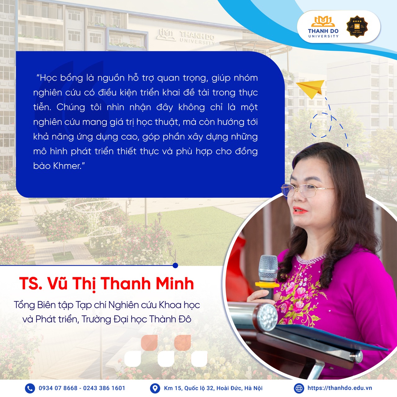TS. Vũ Thị Thanh Minh chia sẻ: “Học bổng là nguồn hỗ trợ quan trọng, giúp nhóm nghiên cứu có điều kiện triển khai đề tài trong thực tiễn. Chúng tôi nhìn nhận đây không chỉ là một nghiên cứu mang giá trị học thuật, mà còn hướng tới khả năng ứng dụng cao, góp phần xây dựng những mô hình phát triển thiết thực và phù hợp cho đồng bào Khmer.”