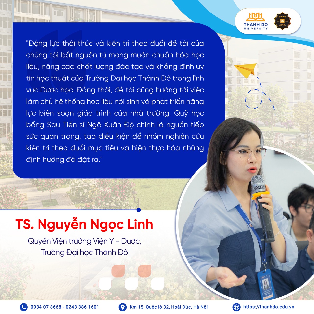 Trong lĩnh vực y dược, Nhóm nghiên cứu với đại diện là TS. Nguyễn Ngọc Linh – Viện Y-Dược, Trường Đại học Thành Đô, tập trung vào một nhiệm vụ có tính nền tảng nhưng mang ý nghĩa lâu dài: xây dựng và chuẩn hóa bộ giáo trình Hóa Dược. Trong bối cảnh tài liệu đào tạo còn thiếu tính hệ thống, dự án không chỉ giúp nâng cao chất lượng giảng dạy, mà còn tạo điều kiện để sinh viên tiếp cận kiến thức một cách bài bản, hiện đại và gắn với thực tiễn nghề nghiệp.